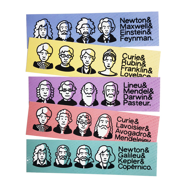 Suas leituras vão ficar muito mais estilosas com este conjunto de marcadores de página. São cinco unidades, cada uma com um tema: Mulheres da Ciência (Marie Curie, Vera Rubin, Rosalind Franklin e Ada Lovelace), Físicos (Isaac Newton, James Clerk Maxwell, Albert Einstein e Richard Feynman), Biólogos (Carlos Lineu, Gregor Mendel, Charles Darwin e Louis Pasteur), Químicos (Marie Curie, Antoine Lavoisier, Amedeo Avogadro e Dmitri Mendeleiev) e Descobridores do Cosmos (Isaac Newton, Galileu Galilei, Johannes Kepler e Nicolau Copérnico).